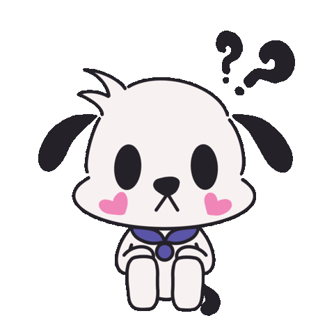 An adorable animated white puppy character with black ears and pink cheeks looks confused as question marks appear above its head, expressing curiosity or bewilderment.