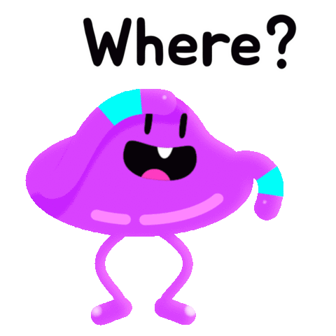 A cute purple blob character with a questioning expression asks 'Where?' in this animated sticker.