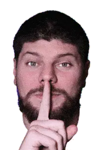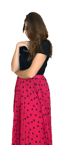 A woman in a black t-shirt and red heart-patterned skirt makes a 'shush' gesture, then smiles and points.
