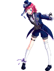 Animated sticker of Quincy from Afterl1fe, a character with pink hair in a blue formal outfit and hat.