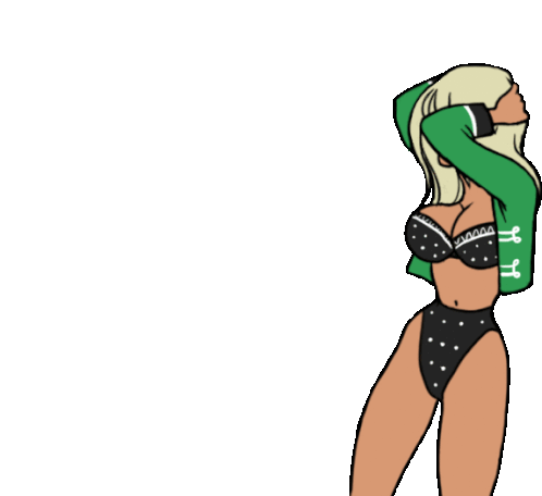 Quincy UK, a cartoon woman with blonde hair, dances confidently in a black polka-dot bikini and a stylish green jacket.