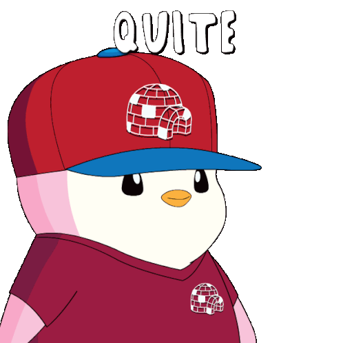 A Pudgy Penguin wearing a red cap and shirt, with 'QUITE' text, conveying silence, calm, and introspection.