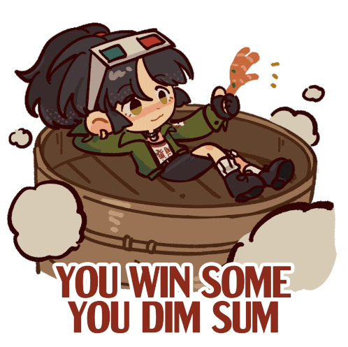 Ananlee from Reverse: 1999 relaxes in a dim sum steamer, holding shrimp with chopsticks, with the pun 'You Win Some You Dim Sum'.