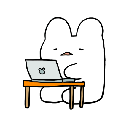 A cute, busy rabbit character diligently working on a laptop at a small table, perfect for study or work.