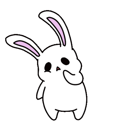 An adorable white cartoon rabbit with pink ears, animated with a thoughtful then curious expression, touching its face.