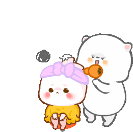 A cute animated sticker showing a white bear drying the hair of a small, sad-looking bunny character wearing a pink bow and yellow dress.