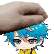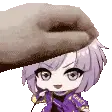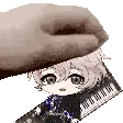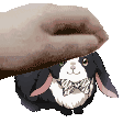 Rabi-chan, the adorable black and white rabbit from Argonavis, is gently petted by a hand, wearing its signature bow tie.