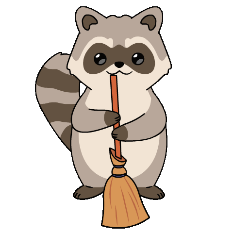 An adorable cartoon raccoon stands upright, diligently sweeping with a broom, looking content and happy while cleaning.