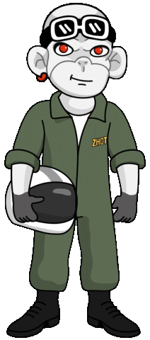 A cartoon monkey racer in a green suit with 'ZHOT' on the sleeve, holding a helmet with a star design that appears and disappears.