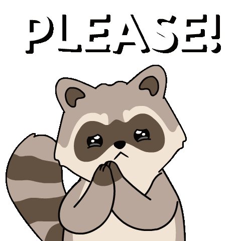 An adorable cartoon racoon with big, sad eyes begs with folded paws, expressing a heartfelt 'PLEASE!' for a favor or treat.