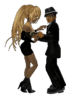 An animated man in a suit and fedora dances with a woman in a black dress and high heels, holding hands.