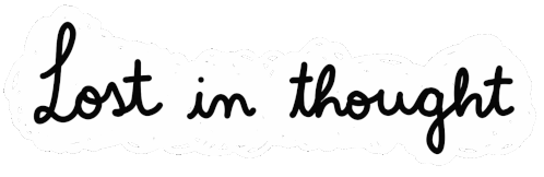 An animated sticker by Rafs, featuring a thought bubble with the text 'lost in thought' in a flowing script.