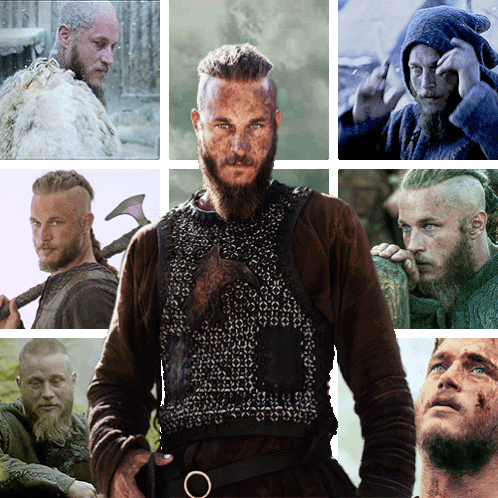 Ragnar Lothbrok from Vikings in a dynamic collage, showcasing his fierce warrior spirit and iconic look.