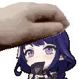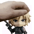 Animated sticker featuring Raiden from MGS, with a hand holding a gun dramatically over a figurine of Juno.