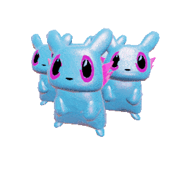 A pixelated swarm of blue and pink Rain World Rivulet creatures disperses and floats upwards against a white background.