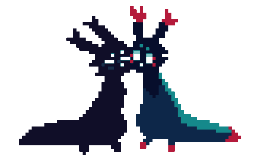 Pixel art animation featuring two Rain World Slugcats, one dark and one teal, leaning in for a kiss.