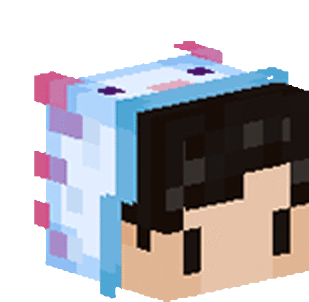 A pixelated character head wearing an adorable axolotl hat that cycles through various rainbow colors.
