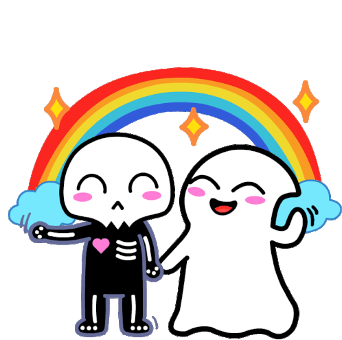 An adorable animated sticker featuring a cute cartoon skeleton and a friendly ghost holding hands under a vibrant rainbow.