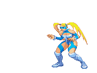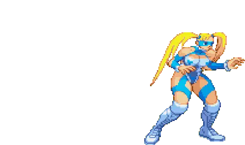 Rainbow Mika from Street Fighter performs her iconic Flying Peach attack, a dynamic pixel art animation.