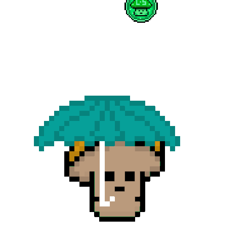 A cute pixel mushroom holds an umbrella as green spore coins rain down, celebrating 'Spores Raining Day' in this fun sticker.