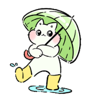 A cute white cartoon cat, possibly Missyou or Missrainy, stands in a puddle with yellow boots and a green umbrella.