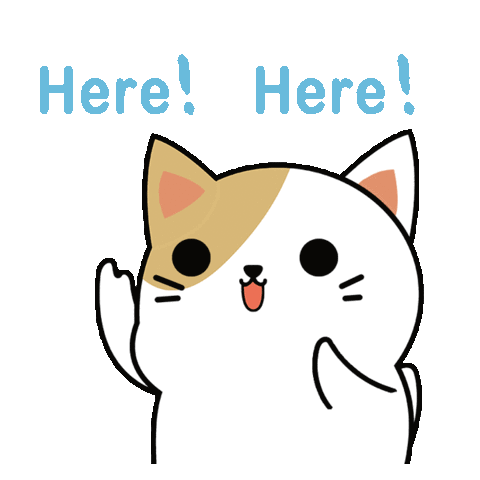 An adorable animated sticker of a white cat with tan patches, enthusiastically raising its paw, perfect for volunteering or asking a question.