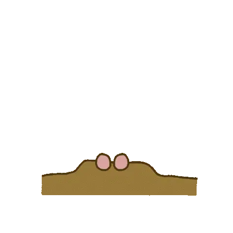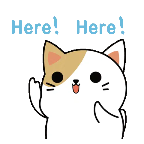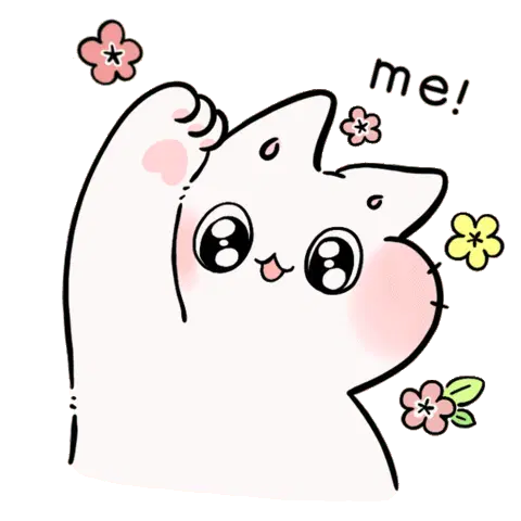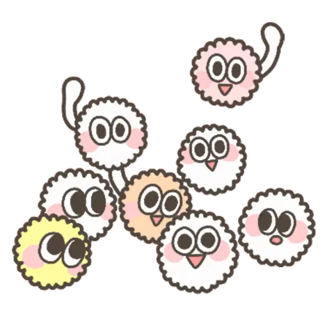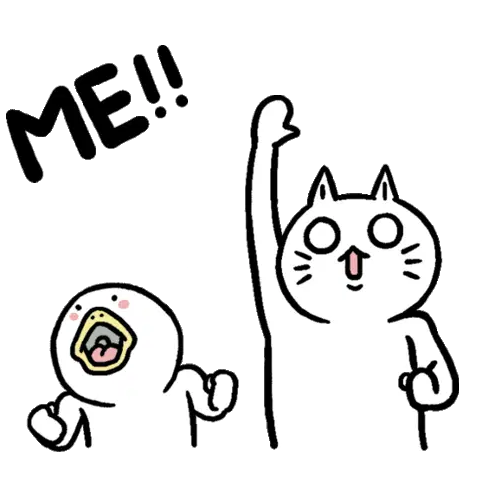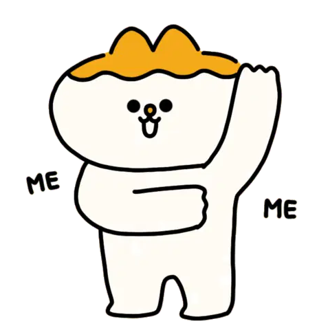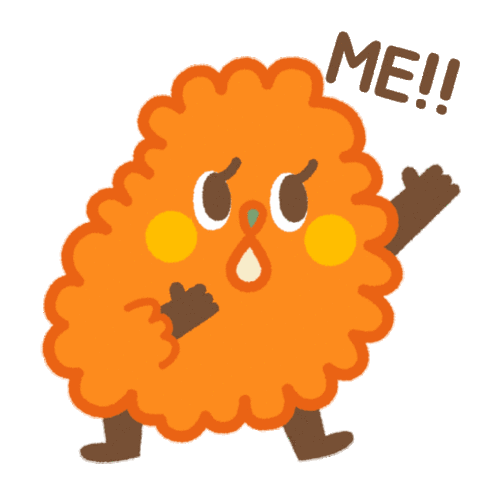 A cute yellow blob character with red eyes raises its small hands, possibly asking a question or showing excitement.