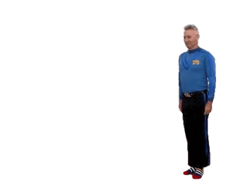 Anthony Field from The Wiggles performs a balancing act, raising his leg and stretching his arms out wide, then bringing them down.