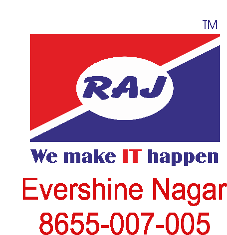 Animated sticker featuring the Raj Computers logo, slogan 'We make IT happen', Evershine Nagar, and phone number.