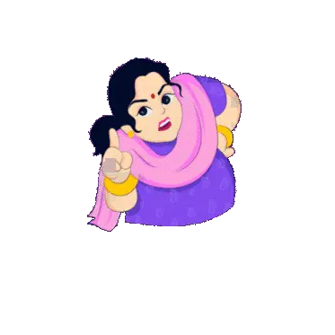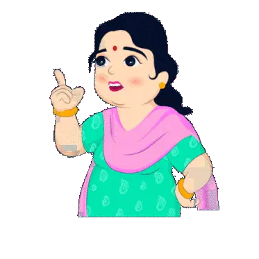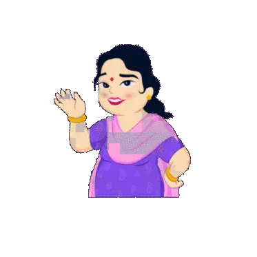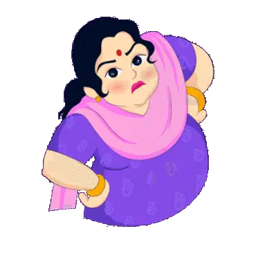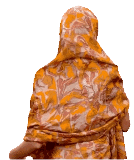 Raju Mummy, a woman in a vibrant yellow and orange saree, smiles playfully while looking over her shoulder.