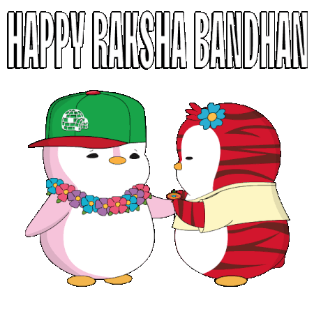 Cute cartoon penguins celebrate Raksha Bandhan, with one tying a rakhi on the other's wrist, symbolizing sibling love and protection.