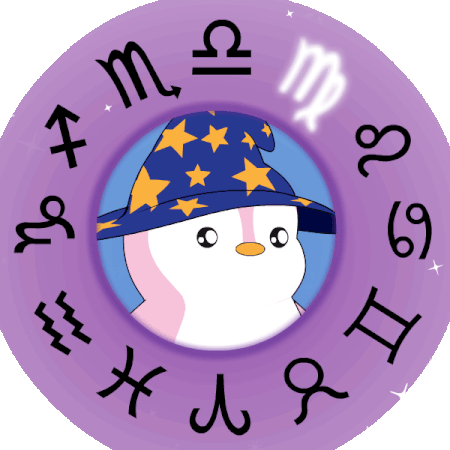 a penguin wearing a wizard hat is in the center of a circle with zodiac signs around it