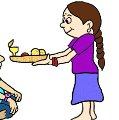 A sister performs the Raksha Bandhan ritual for her brother, offering a thali with sweets and a lamp, symbolizing love.
