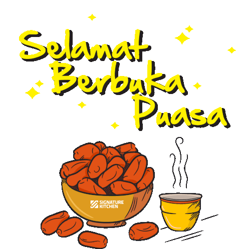 A festive greeting 'Selamat Berbuka Puasa' with a bowl of dates and a steaming hot drink, celebrating the breaking of fast.