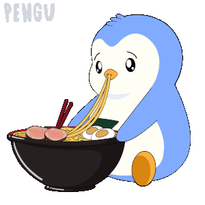 A cute cartoon penguin, Pengu, happily slurps long ramen noodles from a bowl with chopsticks, enjoying a delicious meal.