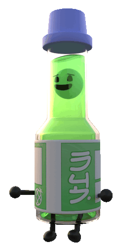 Ramune Bias, a lively green Ramune bottle with a happy face and small arms, wiggles and dances energetically, bringing a fun vibe.