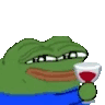 A pixelated green frog character, Peepo, with a smug smile, holding a glass of red wine in a relaxed pose.