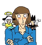 Ranfren Nyen, a pixel art man, has a tiny angel on one shoulder and a tiny devil on the other, contemplating a choice.
