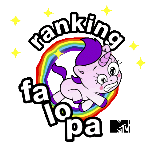 An animated sticker featuring a stressed purple unicorn with a rainbow and the text "ranking falopa MTV".