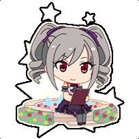 Ranko Kanzaki, the Idolmaster chibi character, sits by a fountain, holding a tablet, surrounded by flowers.