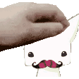A hand gently pats the head of Raphifou 1201, a cute cartoon character with a mustache and pink nose.