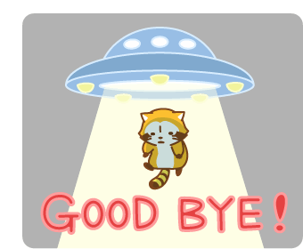 Rascal the raccoon character is surprised, then beamed up by a UFO with a 'GOOD BYE!' message.