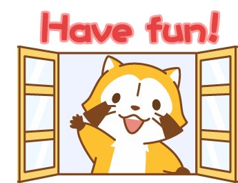 Rascal the raccoon dog waves cheerfully from an open window, wishing everyone to 'Have fun!' with a happy smile.