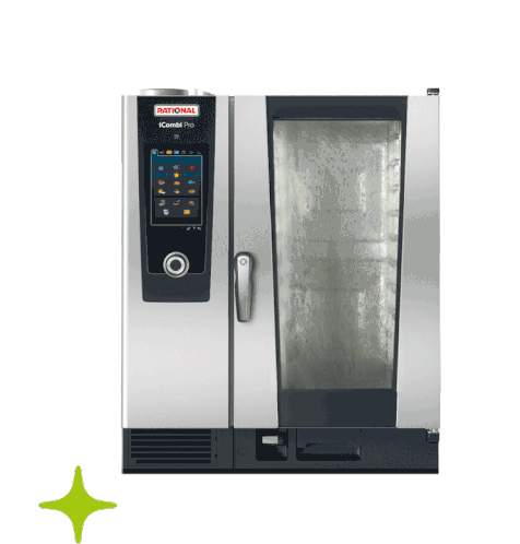 A professional Rational iCombi Pro combi steamer oven is highlighted with a sparkling animation, perfect for chefs and kitchen life.