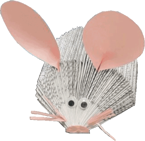 A cute paper craft mouse, Antonella, with large pink ears and googly eyes, blinks playfully.