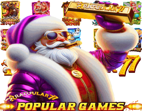 a cartoon of santa claus holding a gold bar with popular games written below him