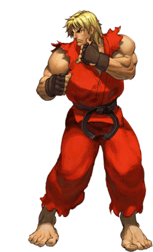 Ken Masters from Street Fighter in his iconic fighting stance, ready for battle. Features the 'ravaoui' tag.