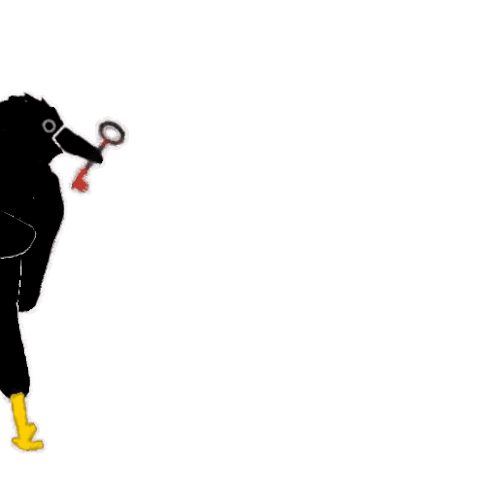 A black raven or crow with yellow feet walks while holding a red key in its beak.