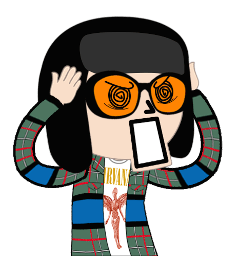 Ravn, wearing a Nirvana t-shirt and plaid jacket, looks distressed with swirly glasses, holding their head in urgency.