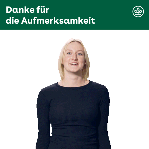 A woman signs 'Danke für die Aufmerksamkeit' (Thank you for your attention) and forms a heart shape with her hands.
